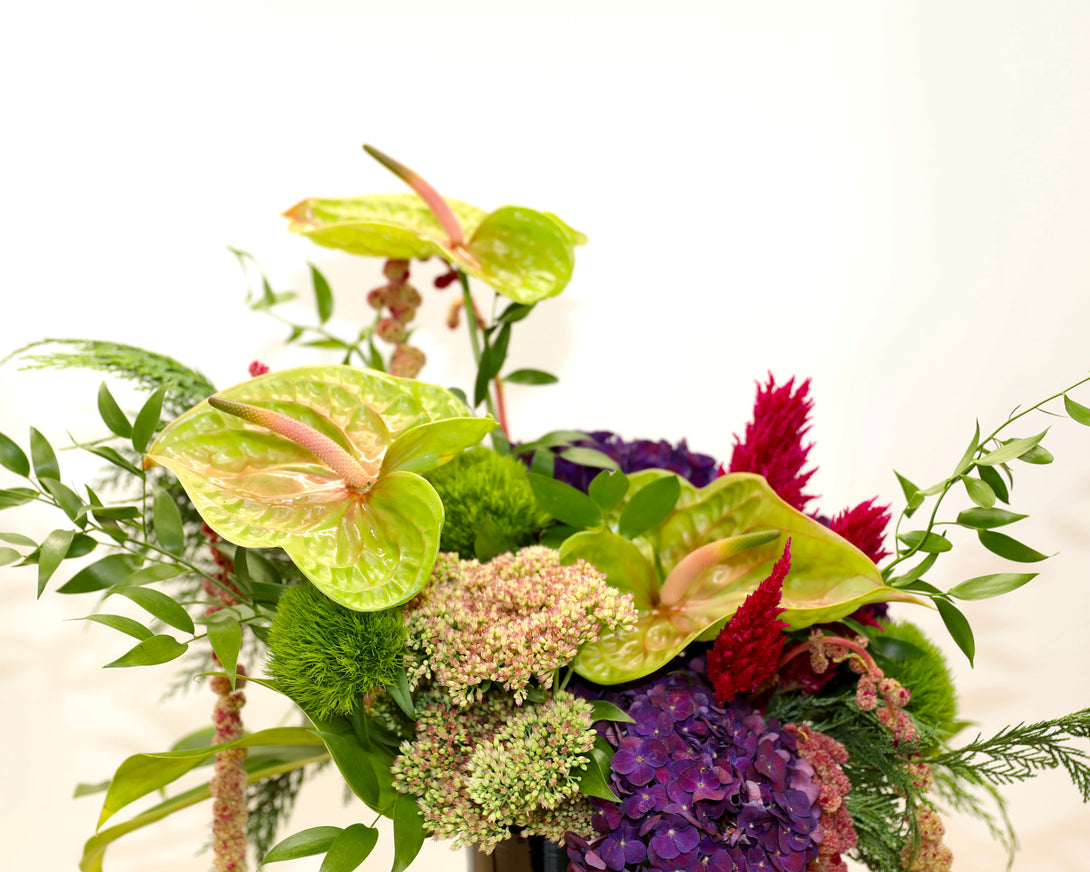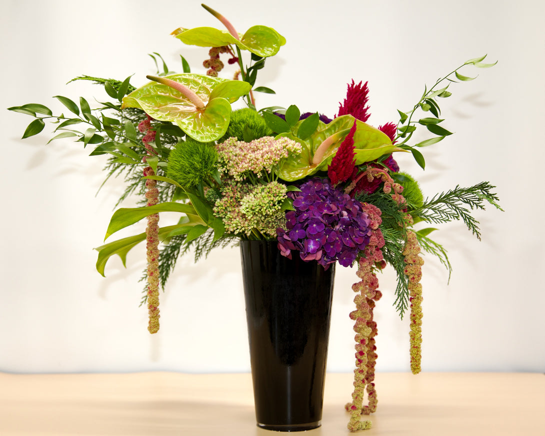 Bring a touch of modern sophistication to any space with our Modern Oasis Luxury Arrangement. Designed in a sleek black vase, this striking display features vibrant anthuriums, hydrangeas,c ascading amaranthus, and fresh seasonal foliage. The bold textures and contrasting colors create a statement piece that is both tropical and elegant, perfect for corporate settings, upscale events, or adding refined beauty to your home.