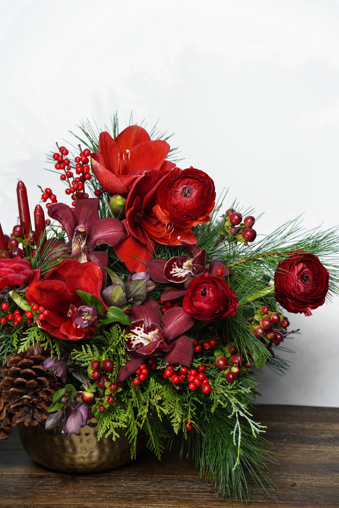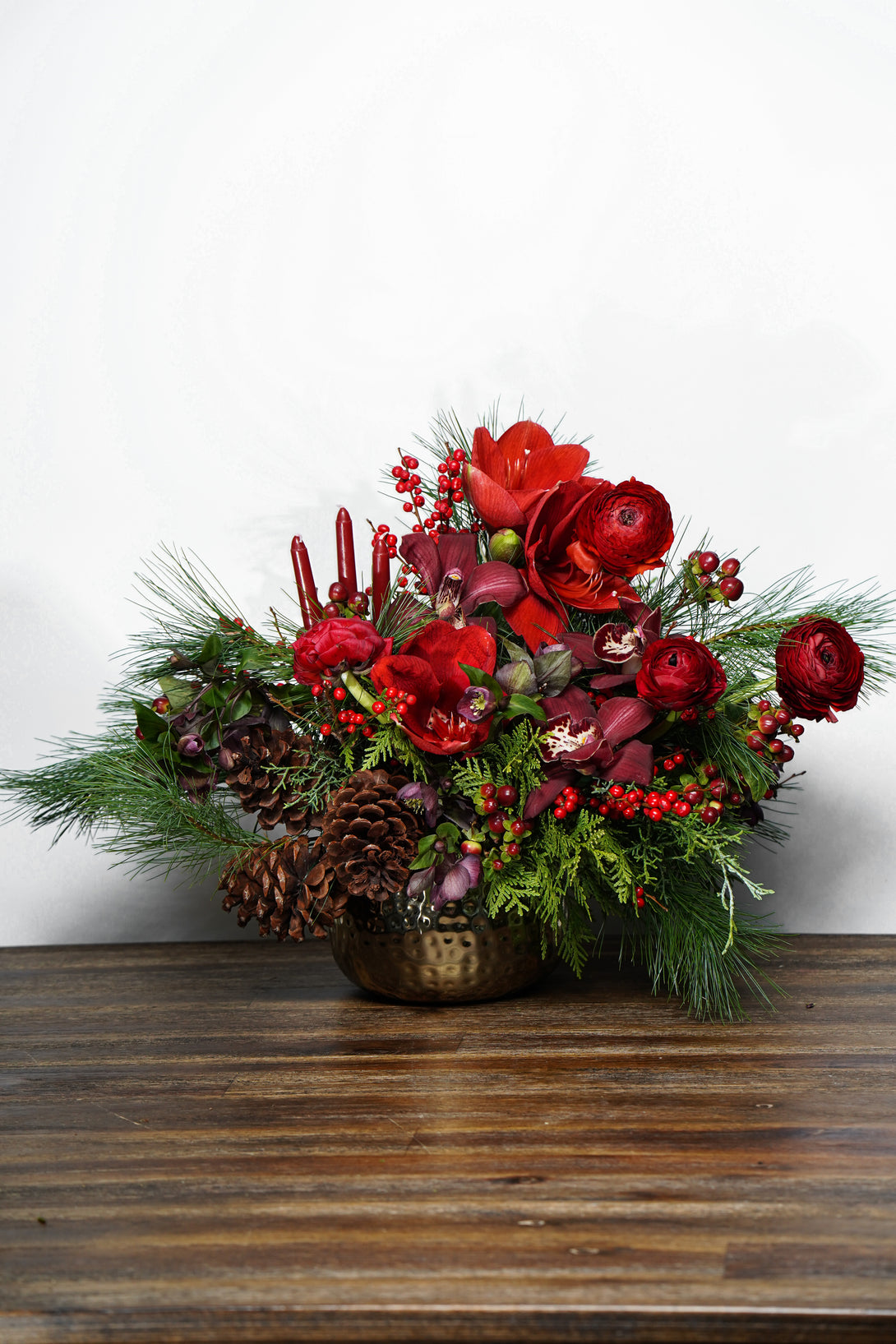 This lush floral design features velvety red blooms, seasonal evergreens, and festive accents of berries and pinecones, creating a rich and textural look that feels both classic and modern. Arranged in a metallic vessel, it’s the perfect statement piece for a holiday table, entryway, or gift to someone special.