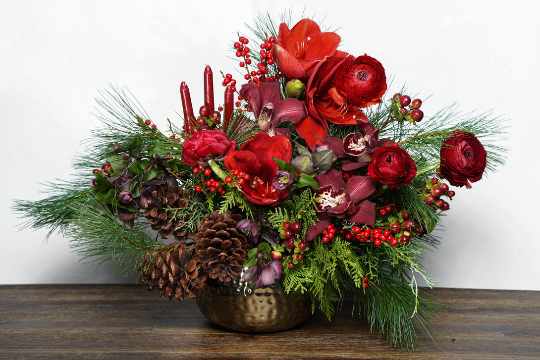 Handcrafted with premium fresh flowers, this arrangement combines deep red tones and natural greenery to evoke the cozy charm of winter celebrations.