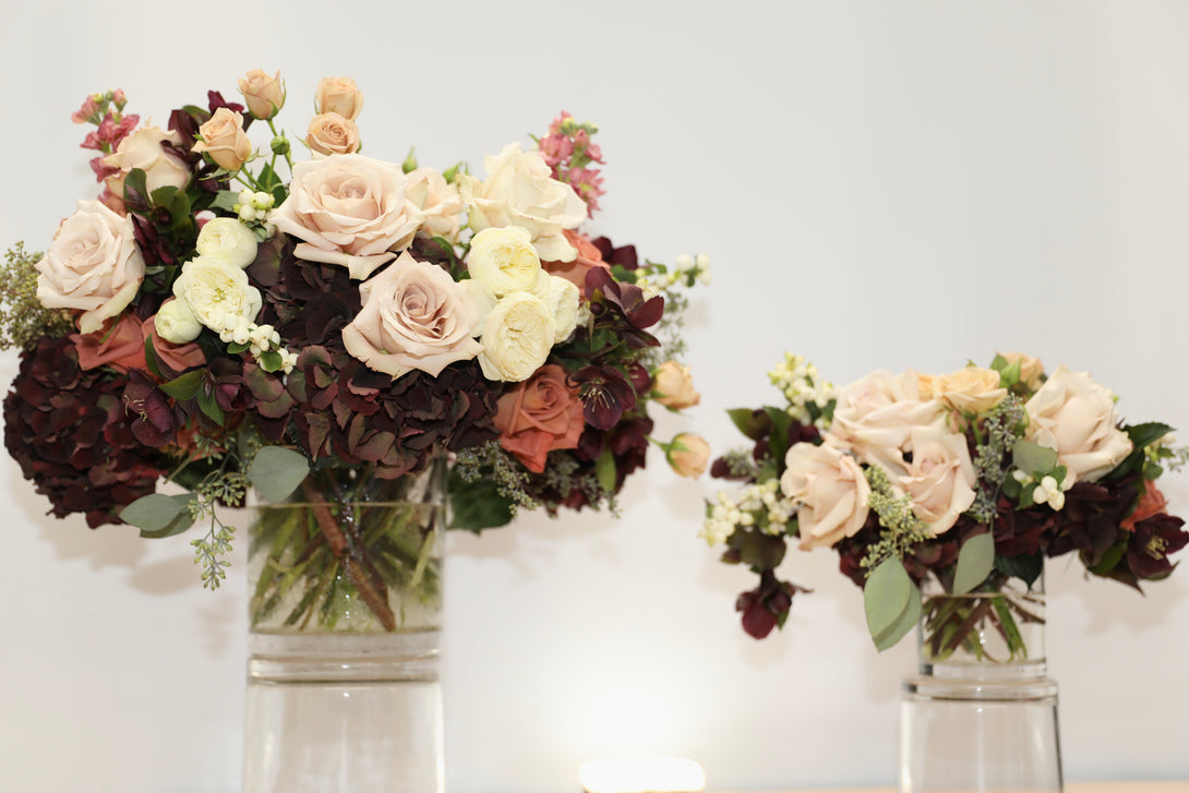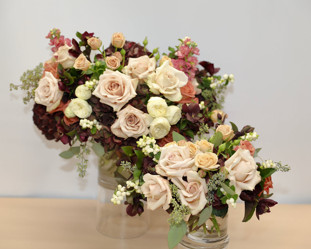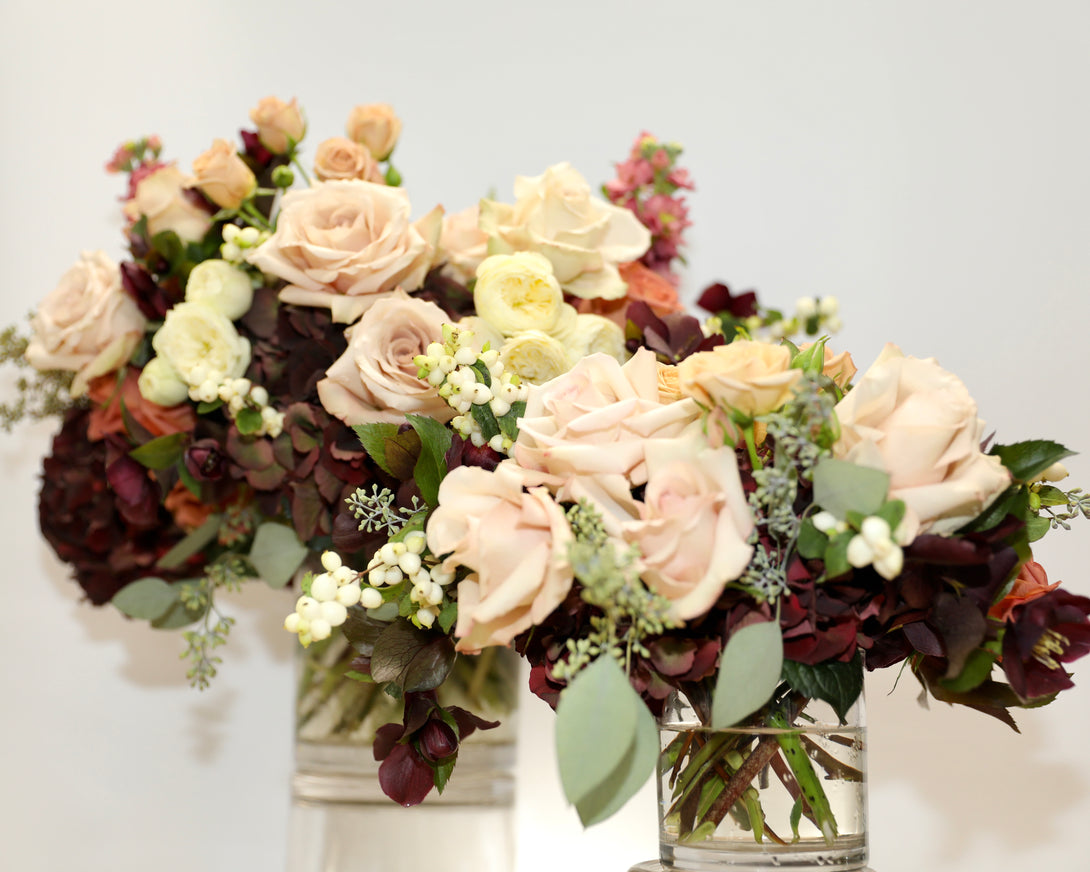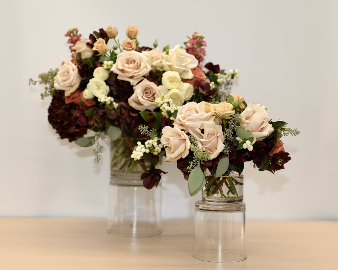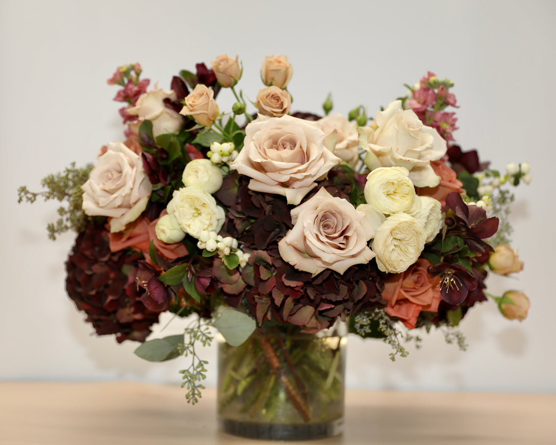 Our Terra Floral Arrangement celebrates the richness of autumn with a harmonious blend of roses, creamy ranunculus, garden spray roses, and deep burgundy hydrangea.